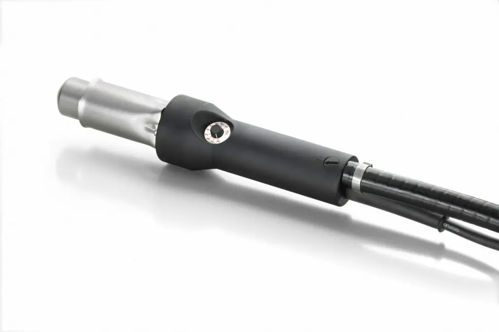 Le pistolet à souder à air chaud MINI-C-electronic avec alimentation en air et en électricité à travers un ensemble de tuyaux. Pour une alimentation en air externe, comme le souffleur Oval-HB ou un compresseur à canal latéral ou un compresseur avec réducteur de pression.